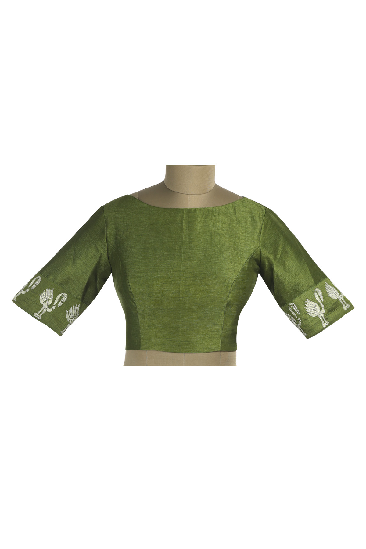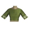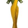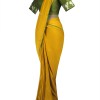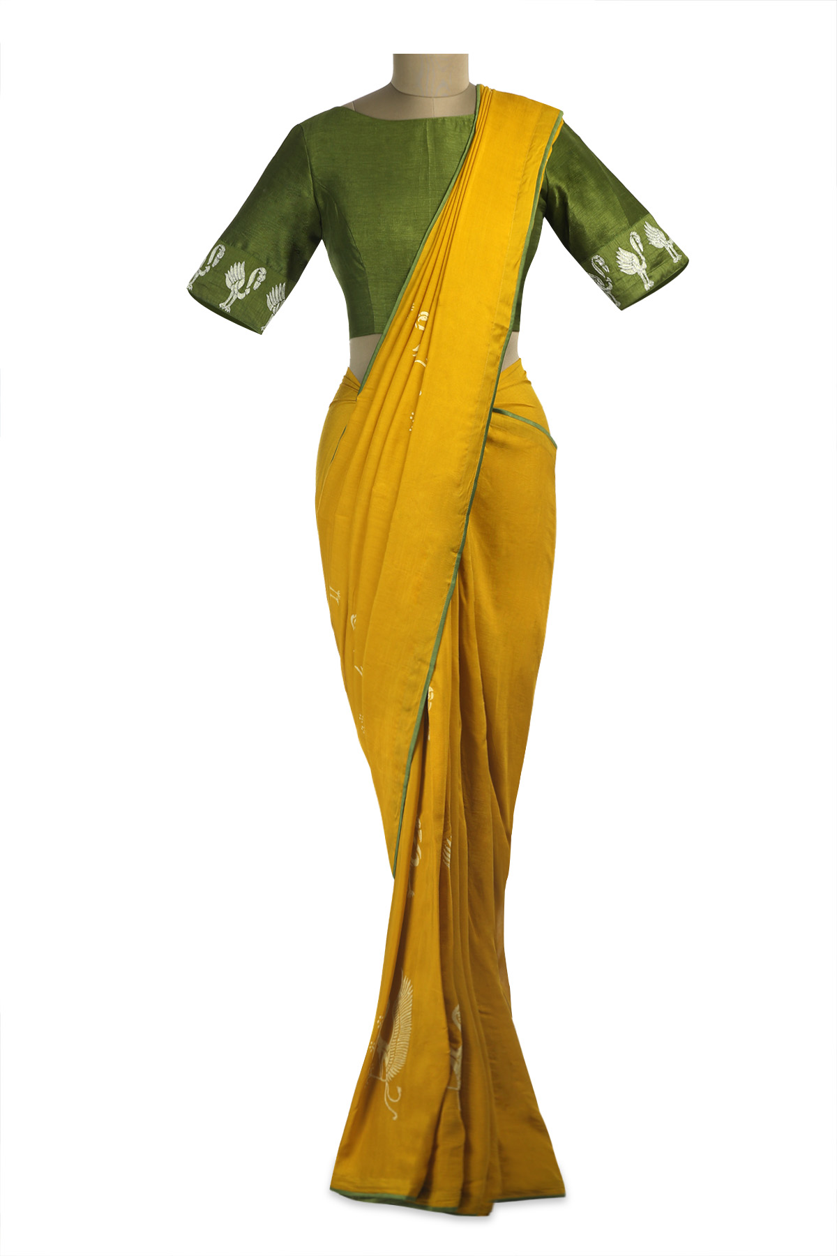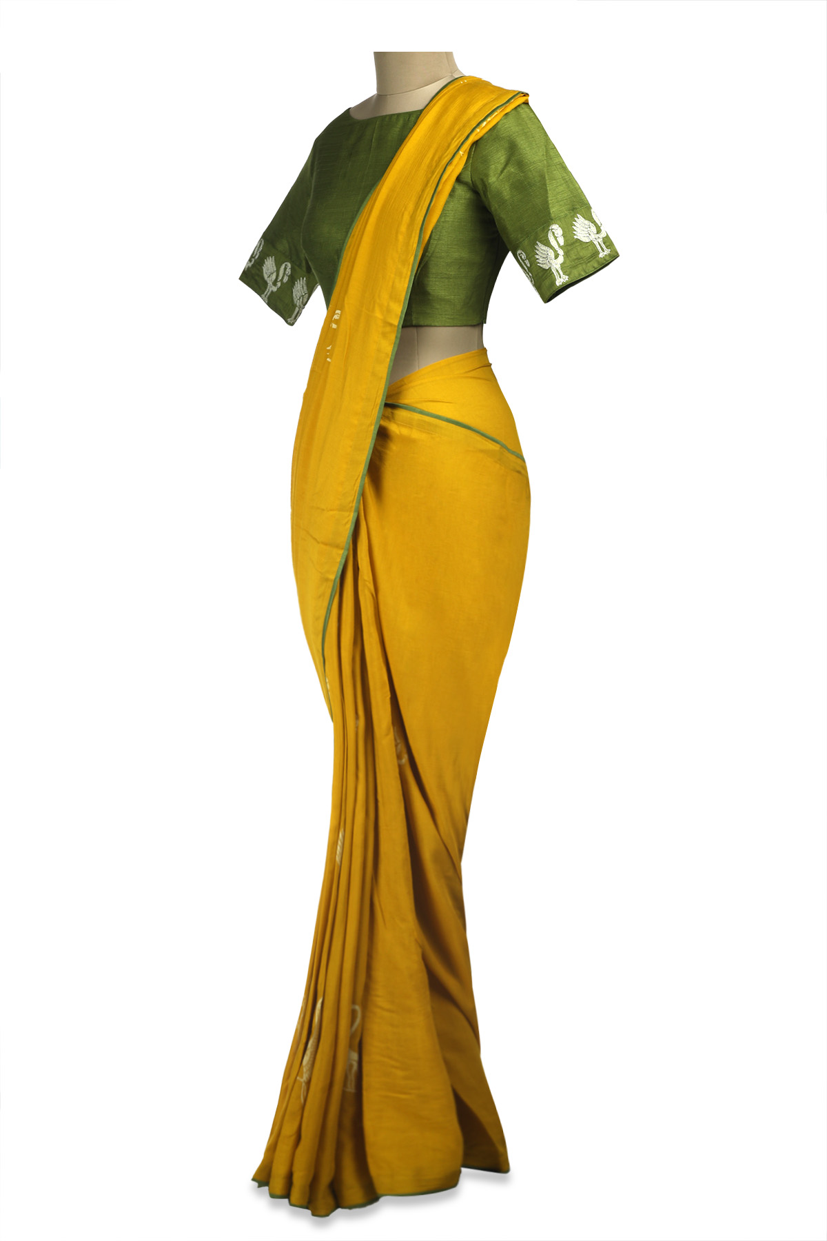 Description: Look fabulous even on a casual occasion with this set having a yellow block printed saree with green borders paired with an olive green and yellow block printed blouse.